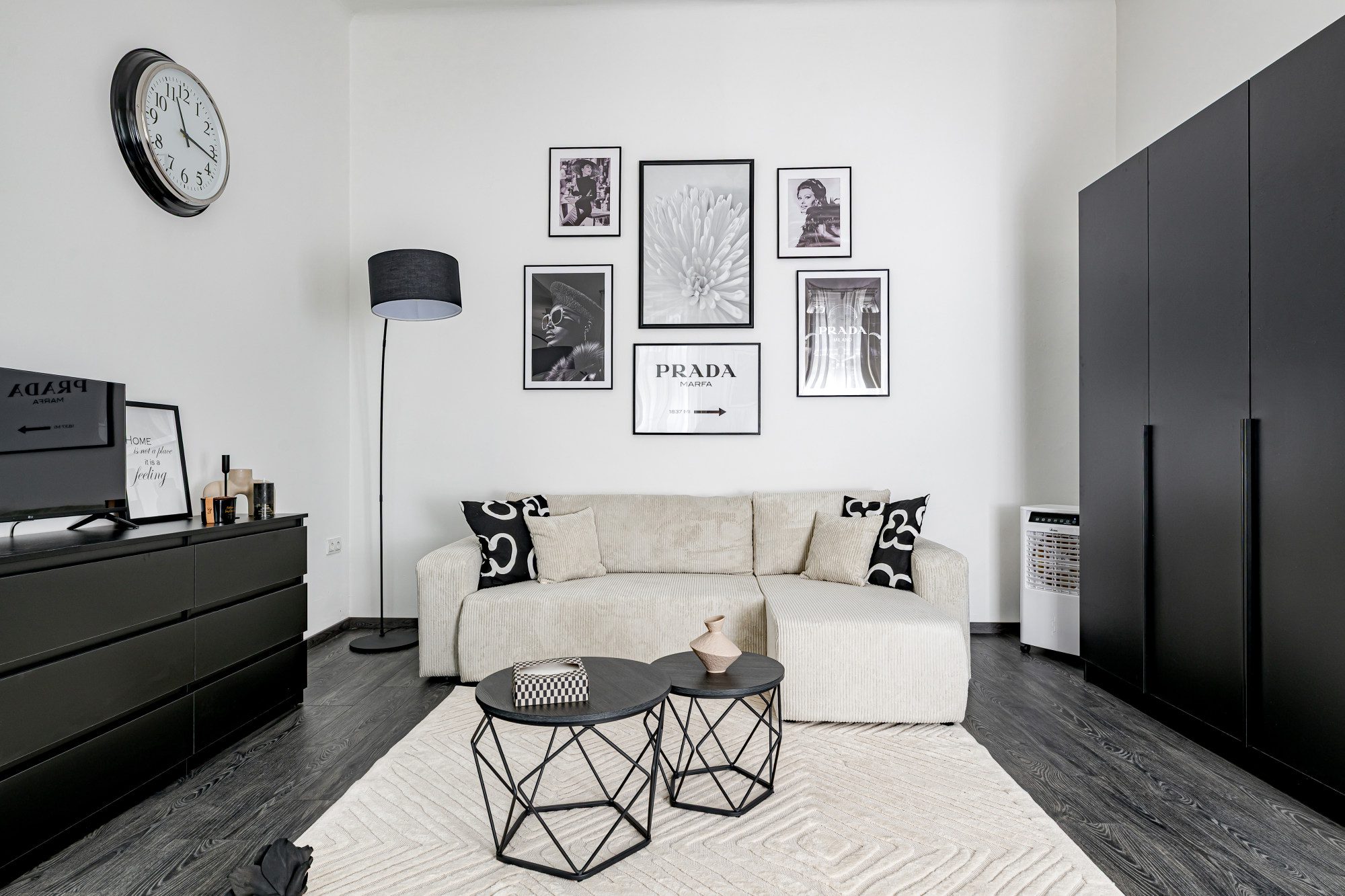 A cél egy harmonikus, időtálló enteriőr létrehozása volt, amely szélesebb célközönség számára is szerethető. A monokróm – fekete, fehér és szürke árnyalatokra épülő – színvilág mellett döntöttünk, mert ez egyszerre modern, elegáns és nyugtató hatású. A bútorok és kiegészítők kiválasztásánál a funkcionalitás és a vizuális egyensúly is fontos szerepet kapott: semmi nem túlzó, minden darabnak megvan a helye és a szerepe.